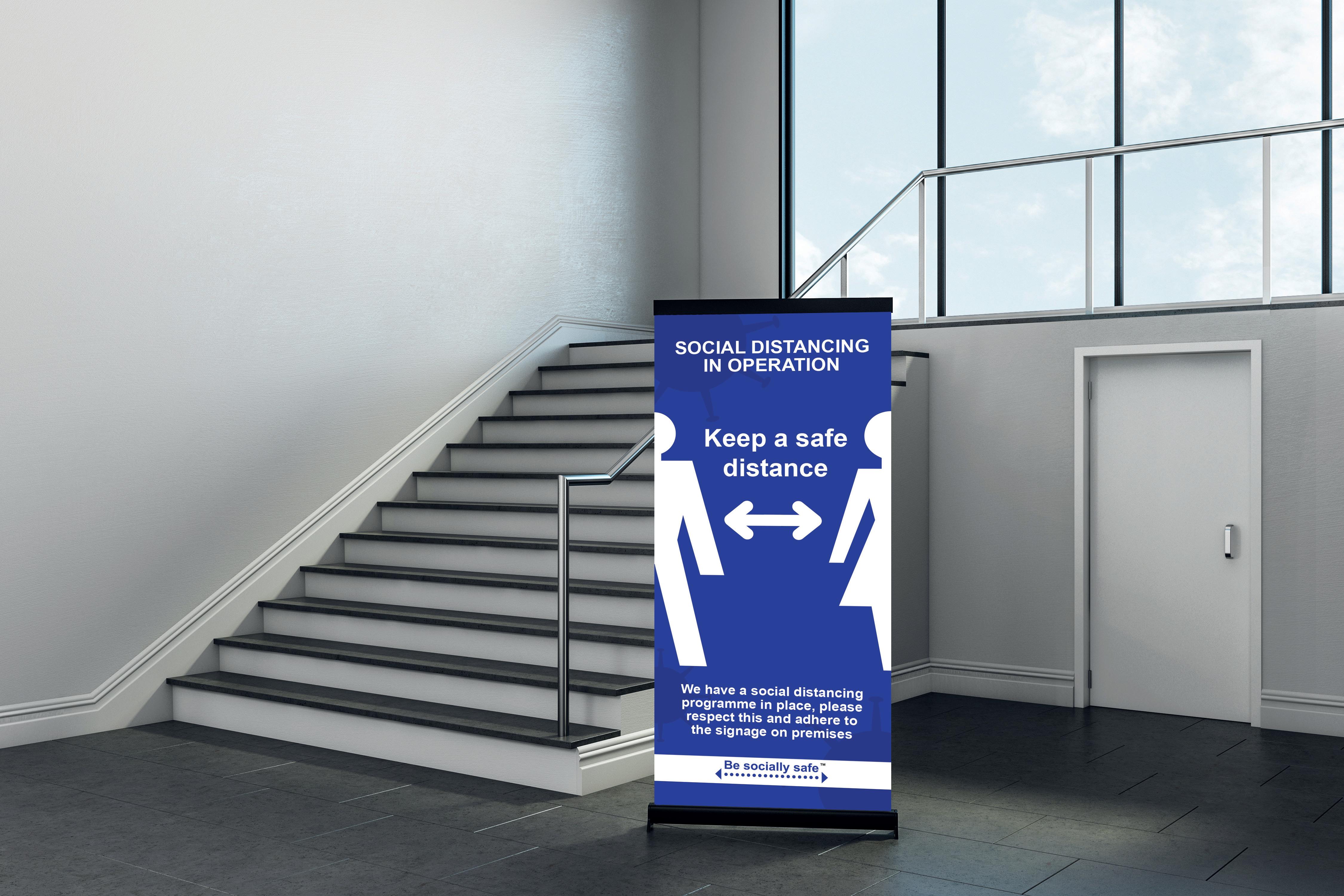 These PVC pull up banners are the ideal product to quickly communicate your social distancing program and remind people to stay apart.