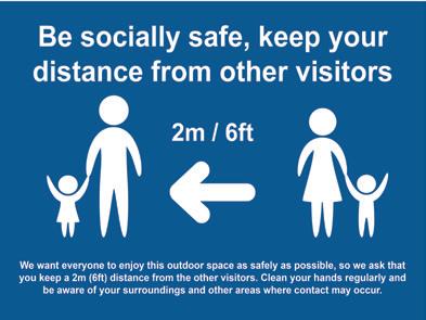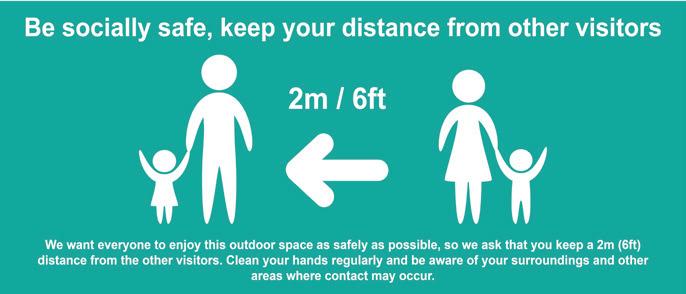 18 We want everyone to enjoy this outdoor space as safely as possible, so we ask that you keep a 1m distance from the other visitors. Clean your hands regularly and be aware of your surroundings and other areas where contact may occur. Be socially safe, keep your distance from other visitors 1m