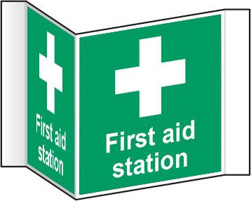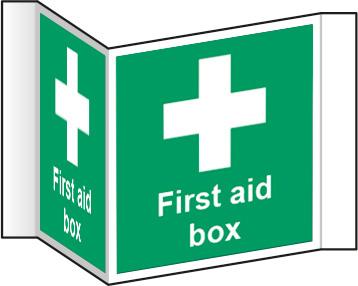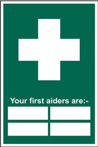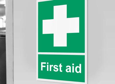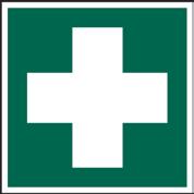 A green rectangle or square with a symbol or text in white providing information about first aid, escape or other safe conditions.