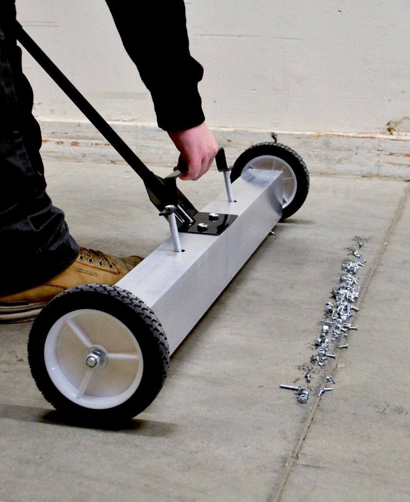 are industrial strength, permanent magnets for the removal of dangerous ferrous objects from roads, parking areas, loading docks, warehouses and other busy areas. Our hang-type magnetic sweepers greatly reduce the possibility of costly and dangerous punctures. Also helps prevent injuries caused by scrap iron particles, screws and nails.. Simply hang this magnetic sweeper from your forklift and “sweep” all contaminated areas. Pull the bar between the forks upwards to release the collected debris.