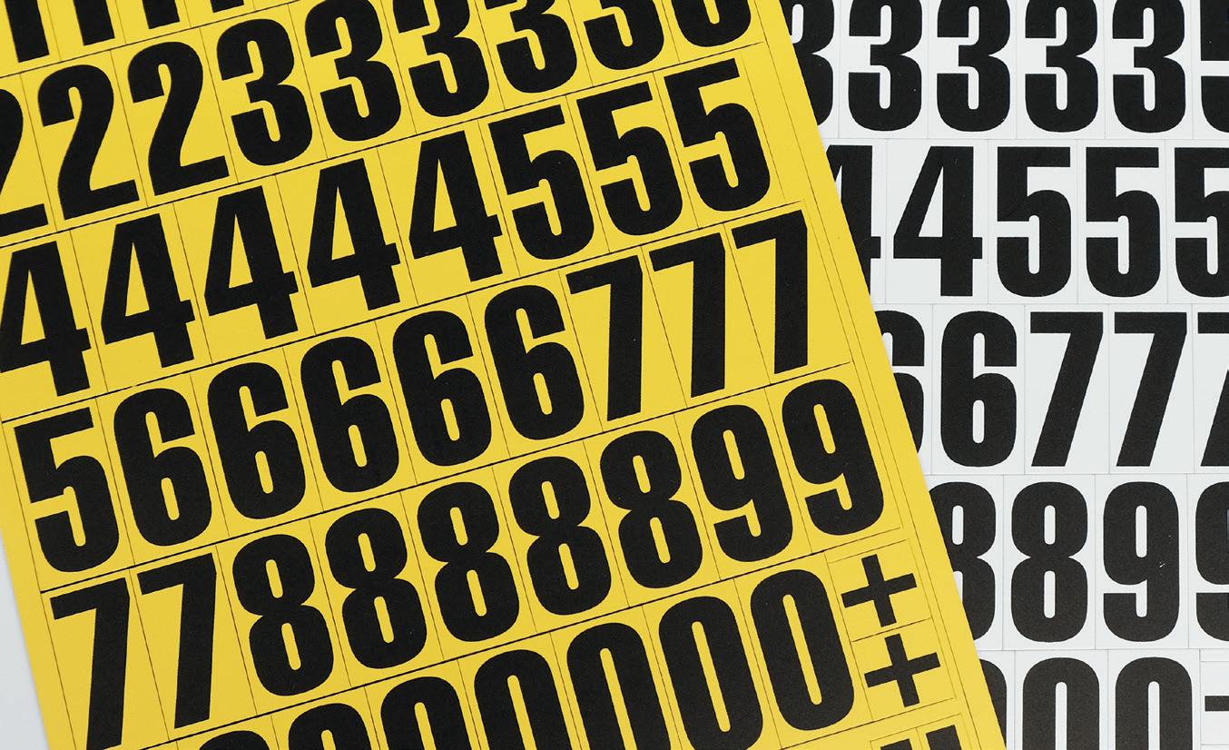 43 MAGNETIC Letter and numbers Individual Self Adhesive Numbers Ideal for location identification on racking, shelving or Steel cabinets, our letters are printed on white or yellow magnetic sheets.Contains either the full alphabet or all numbers with some punctuation in varying quantities. Combine multiple numbers to create a identification system ideal for racking, shelving or steel cabinets. When ordering take into account tiles size, which will be bigger than your character height Magnetic tiles supplied as single sheets • Printed Black on a yellow background • 6 sizes available • Order only the numbers you need Sheet Size: 120 x 235mm Size White Yellow 17mm Letters 13687 13691 17mm Numbers 13688 13692 39mm Letters 13689 13693 39mm Numbers ADHESIVE products Each pack contains one of each number. Supplied in Single Sheets Sheet Size: 120 x 235mm Label Size 14 x 19mm 21 x 38mm 21 x 56mm 38 x 90mm 45 x 130mm 140 x 230mm Character Height 13.5mm 18.5mm 18.5mm 40mm 47mm 144mm Character Per Sheet 96 30 20 9 6 1 Character '0' 16120 16134 16144 16154 16164 16174 Character '1' 16121 16135 16145 16155 16165 16175 Character '2' 16122 16136 16146 16156 16166 16176 Character '3' 16123 16137 16147 16157 16167 16177 Character '4' 16124 16138 16148 16158 16168 16178 Character '5' 16125 16139 16149 16159 16169 16179 Character '6' 16126 16140 16150 16160 16170 16180 Character '7' 16127 16141 16151 16161 16171 16181 Character '8' 16128 16142 16152 16162 16172 16182 Character '9' 16129 16143 16153 16163 16173 16183 A - Z Pack (Self Adhesive) Number Packs (Self Adhesive) Description Label Size Character Height Characters Per Sheet Code A - Z 6 x 9.5mm 4.5mm 456 16184 A - Z 8.5 x 9.5mm 6mm 312 16185 A - Z 14 x 19mm 13.5mm 96 16186 A - Z 21 x 38mm 24mm 30 16187 A - Z 21 x 56mm 24.5mm 20 16188 A - Z 38 x 90mm 45mm 9 16189 A - Z 45 x 130mm 48mm 6 16190 A - Z 140 x 230mm 177mm 1 16191 Description Label Size Character Height Characters Per Sheet Code 0 - 9 6 x 9.5mm 4.5mm 456 16192 0 - 9 8.5 x 9.5mm 6mm 312 16193 0 - 9 14 x 19mm 12mm 96 16194 0 - 9 21 x 38mm 25mm 30 16195 0 - 9 21 x 56mm 25mm 20 16196 0 - 9 38 x 90mm 40mm 9 16197 0 - 9 45 x 130mm 48mm 6 16198 0 - 9 140 x 230mm 180nn 1 16199 01 - 100 25 x 30mm 8.5mm 20 16118 01 - 100 50 x 50mm 19mm 20 16119 Each pack contains one of each letter. Supplied in Single Sheets Sheet Size: 120 x 235mm