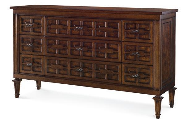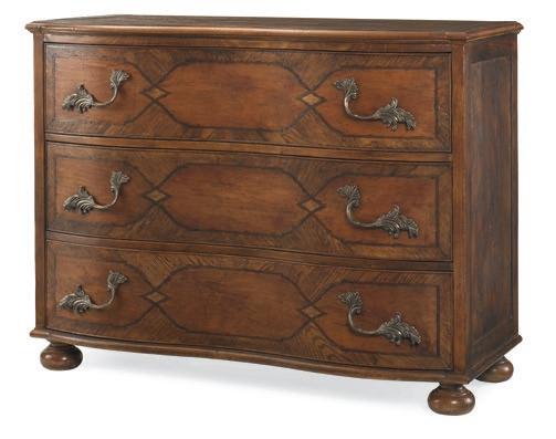 Sierra finish on Oak solids and veneers, Mappa Burl veneers and Walnut inlays. Three soft-close drawers with gunmetal hardware.