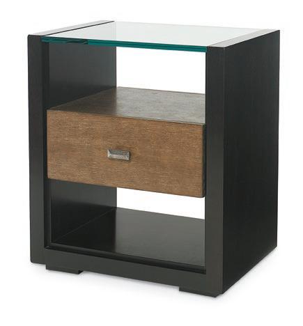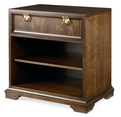 Southport finish on Acacia solids and veneer Single drawer with Satin Brass finish hardware above open shelf.