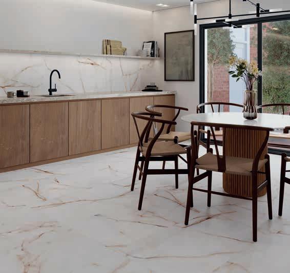 In questa tendenza, le superfici ceramiche diventano elementi decorativi a tutti gli effetti, con finiture ispirate al marmo, all’agata, al quarzo di grande formato, creando un effetto di estrema eleganza e lusso.