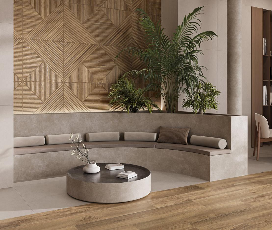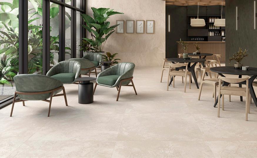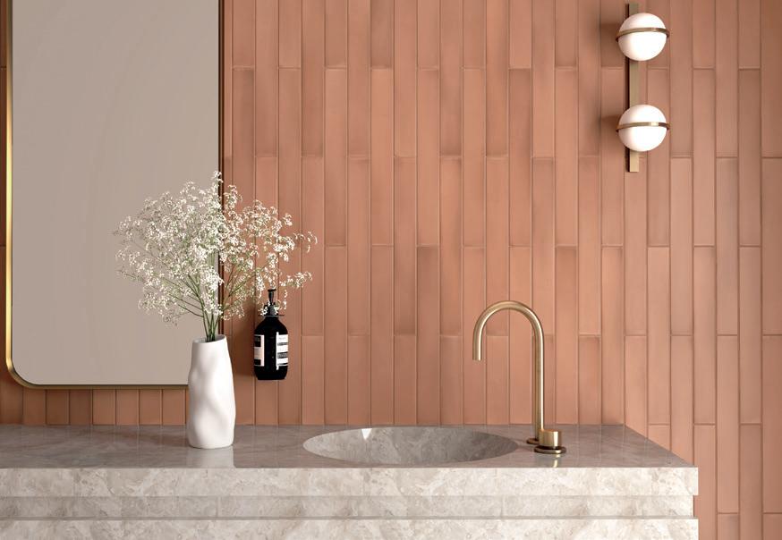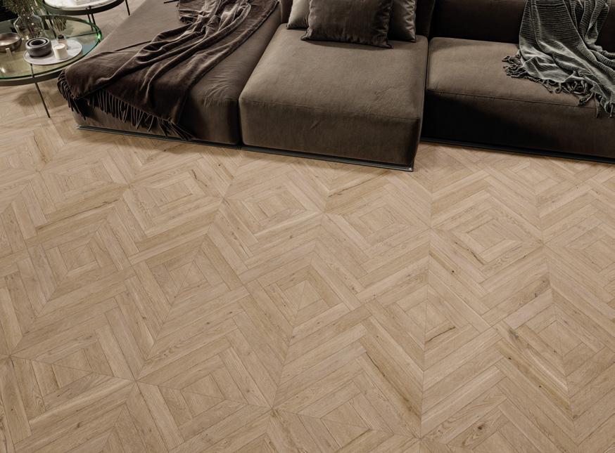Digitally printed wood-effect tiles have matured beyond simple imitation, offering a depth of realism that rivals the real thing. Through high-resolution printing and texturematching, ceramic tiles can now replicate everything from the fine grain of oak to the knots and cracks of reclaimed timber. In addition to authentic visuals, digital layering techniques add tactile relief that precisely mimic real wood surfaces. These tiles offer the warmth of wood with the low maintenance and long-lasting performance of ceramic— ideal for high-traffic areas and damp environments.
