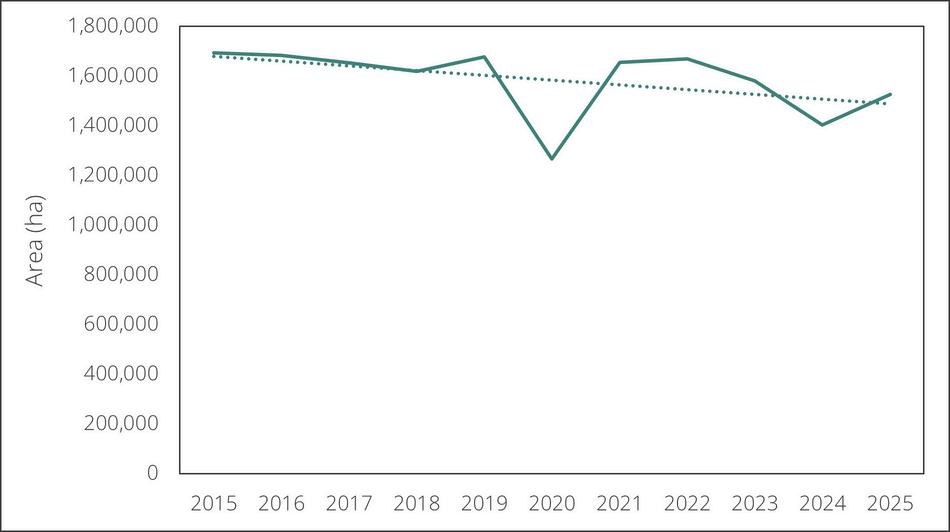 Climatic extremes (particularly drought) had a pronounced impact on crop performance. Cereal yields (except spring oats) declined in comparison to their respective five-year rolling averages (2021-25), with winter wheat showing a third consecutive year of decline since 2022. Winter oats are beginning to display a similar trend, with yields showing a second consecutive year of decline since 2023. In contrast, barley showed greater resilience – winter barley yields rebounded from 2024, and spring barley yields remained relatively stable in line with previous years –both benefiting from rapid spring growth and early-season moisture.