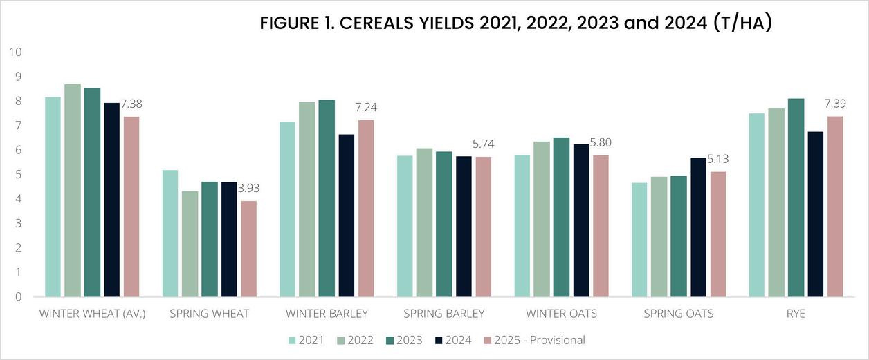 Cereal yields in the 2025 harvest (except spring oats) declined in comparison to their respective five-year rolling averages (2021-25), with winter wheat showing a third consecutive year of decline since 2022.