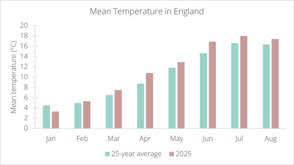 In tandem with significantly lower rainfall totals during the spring and summer, mean air temperatures and total sunshine hours were higher than their respective 25-year averages across the majority of months from January to July-August 2025 (exceptions: January – mean air temperature, February – total sunshine hours) (Figure 2). Summer 2025 was declared the warmest on record for the UK (mean air temperature = 16.1°C), with four relatively short-lived and interspersed heatwaves recorded by the Met Office during the season.