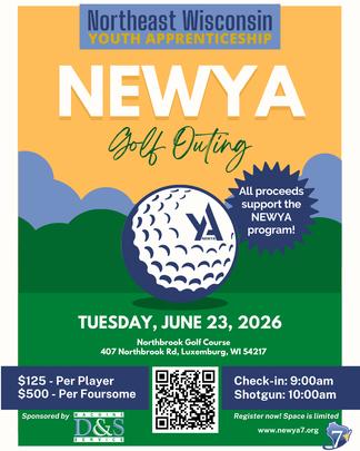 Enjoyadayoffunandfriendly competitionduring18holesofgolf whilesupportingtheNortheast WisconsinYouthApprenticeship (NEWYA)program!Allproceeds benefitNEWYA,helpingtoshape thefutureoflocalstudentsand businesses Gatheryourteamand secureyourspottoday!