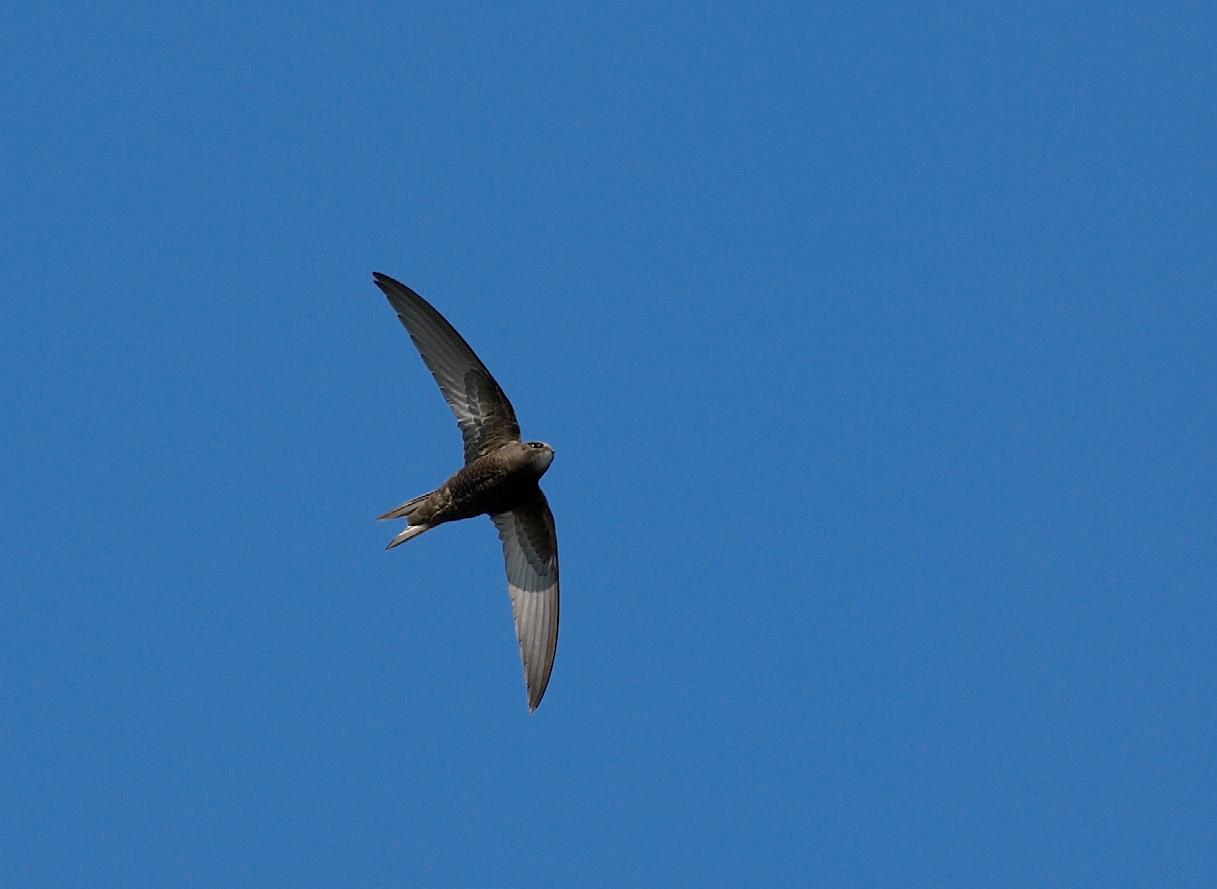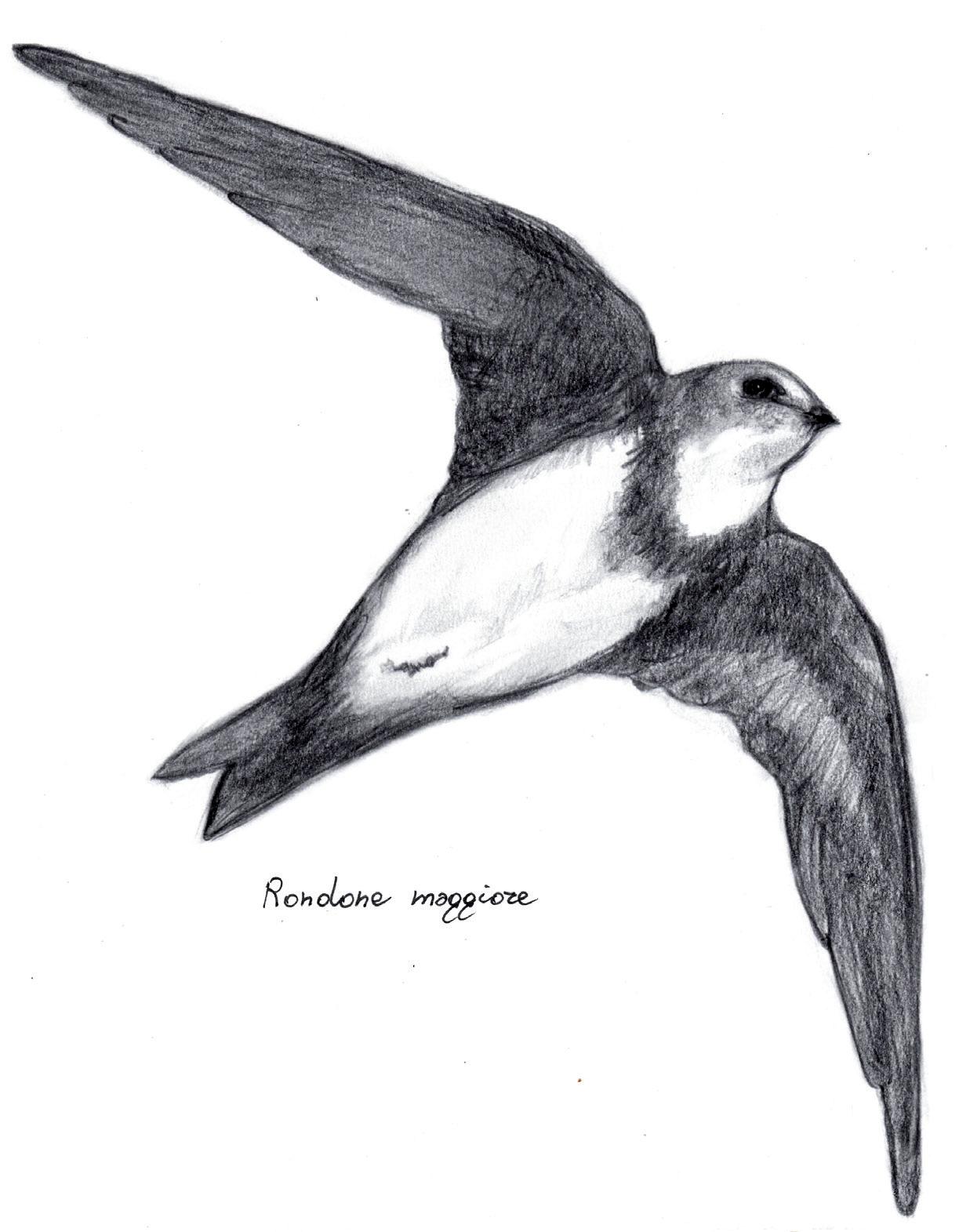 Il Rondone comune (Apus apus) è più grande sia della Rondine sia del Balestruccio, sembra completamente nero a parte una zona più chiara sotto la gola.