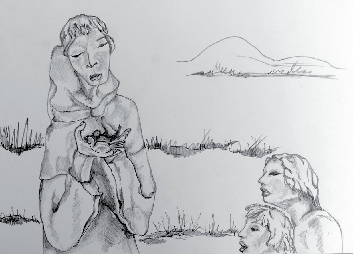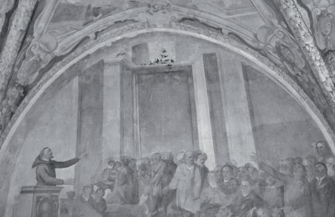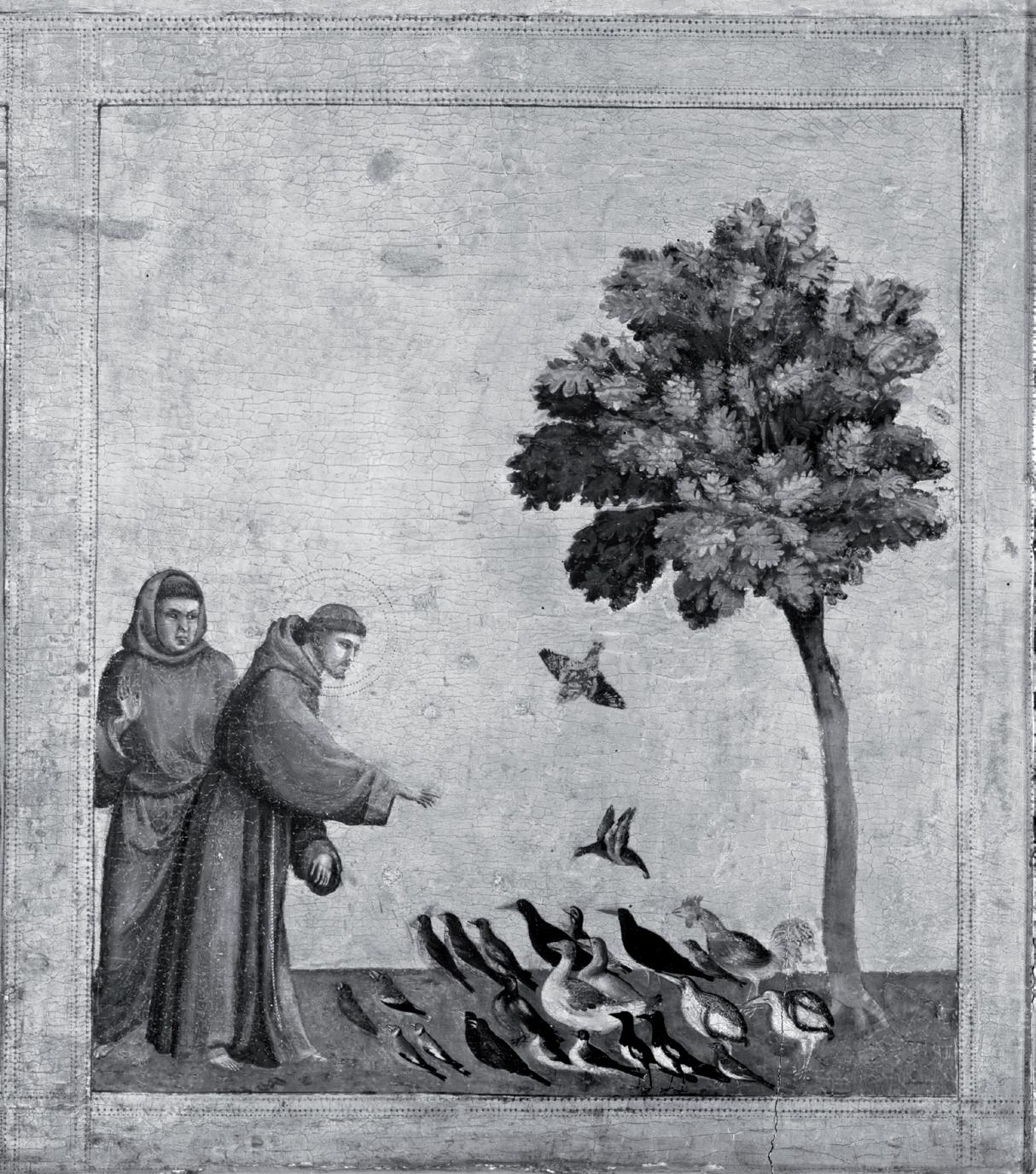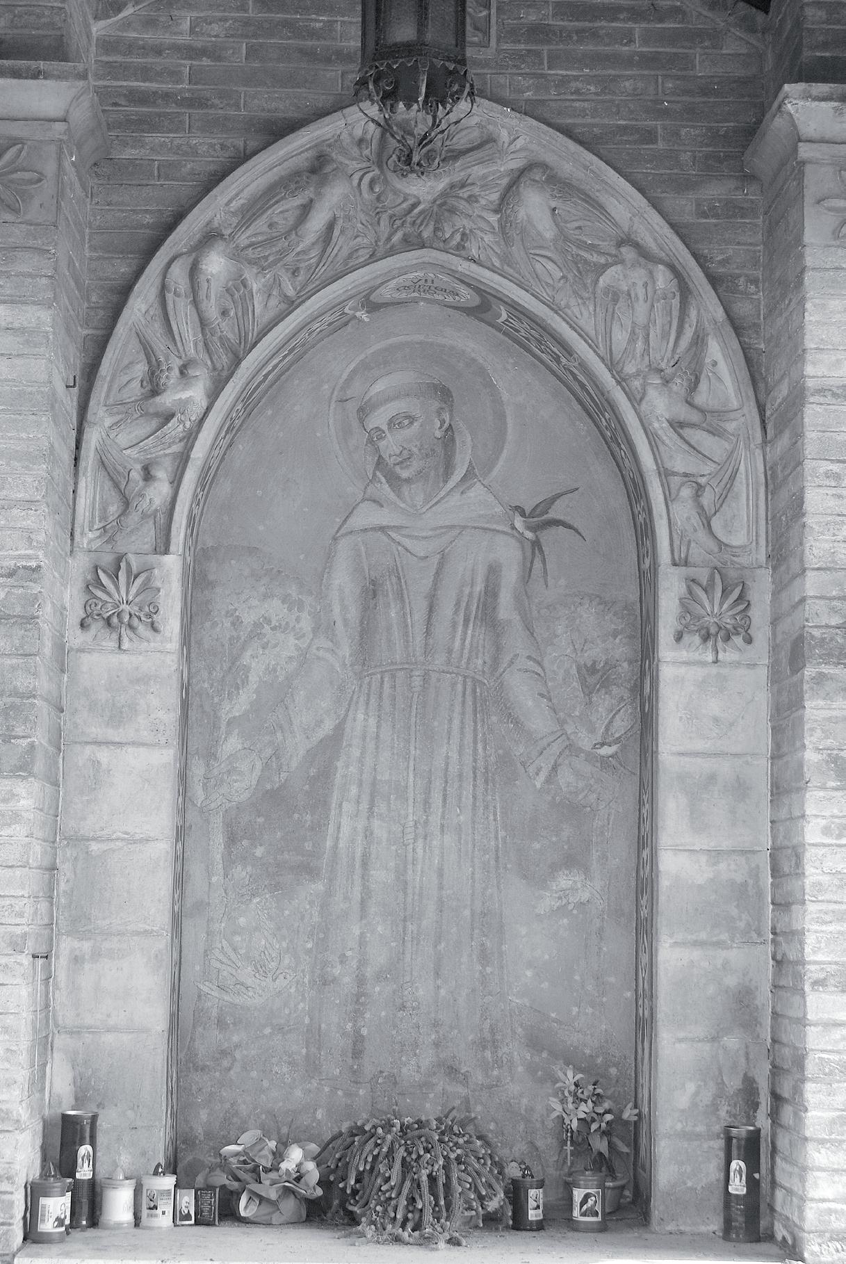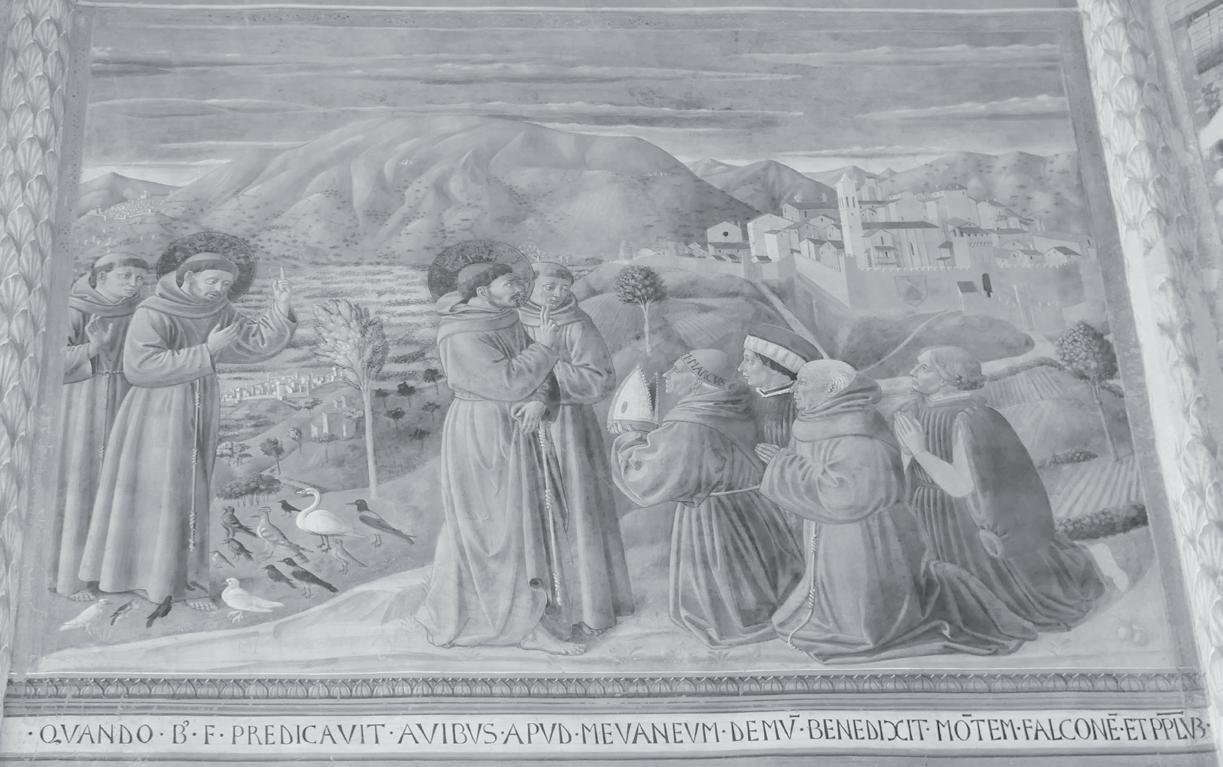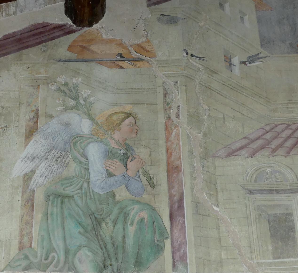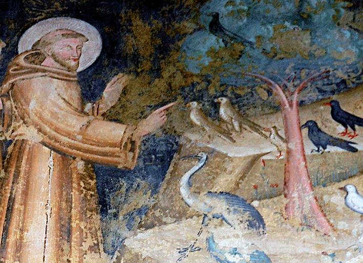 Alla bellezza delle raffigurazioni si aggiunge il nostro stupore nell’osservare che la vetrata e le statue portano evidenti i segni dell’inciviltà della nostra epoca. Guardando lontano si scorgono il Lazio e la Toscana, si riconoscono i monti Cimini e i rilievi dell’Amiata. Nella valle sottostante una distesa azzurra: il Lago di Alviano. Quest’area umida si è creata in seguito allo sbarramento del fiume Tevere, i terreni agricoli sono stati invasi dalle acque ed in breve si è sviluppato un fitto canneto ed è cresciuto un bosco ripariale.