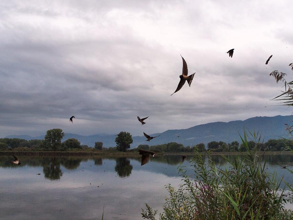 Si va avanti fino a notte fonda, i numeri si susseguono veloci, nel silenzio dello svolgimento dell’attività di raccolta dati. Ad ogni uccello viene apposto un anello di metallo con inciso un numero di serie, poi con dei codici si assegna, quando è possibile, l’età ed il sesso in base alle caratteristiche del piumaggio. Seguono le misure della lunghezza dell’ala e della terza penna remigante, espresse in decimi di millimetro: si stima l’accumulo di grasso sottocutaneo e la dimensione dei muscoli sul petto, infine la Rondine viene pesata. Una manciata di secondi in cui mani esperte e delicate maneggiano gli uccelli che poi vengono custoditi in una grossa scatola di cartone. Si dorme poco e prima dell’alba siamo già di ritorno in palude. é il momento più bello del giorno, gli uccelli iniziano a cantare, l’aria è ancora fresca. L’umidità della notte ha ricoperto tutto costringendoci a indossare vestiti impermeabili che presto spariranno sotto il caldo asfissiante. Il sole sorge dietro il monte Orve e liberate dalle scatole di cartone dove sono state ospitate per la notte, le Rondini si alzano in cielo formando subito una nuvola compatta. è un’emozione forte, indescrivibile a chi non l’ha mai provata. è come lanciare un messaggio nello spazio, in attesa di una risposta. Si spera che qualche altro ricercatore ne ricatturi una e segnali attraverso il network internazionale, la località e la data del suo ritrovamento. In questo modo si sono potute ricostruire le rotte migratorie di molte specie di uccelli e i dati raccolti sul campo dagli ornitologi formano il più grande database europeo sugli animali selvatici. Ci auguriamo che il prossimo anno siano