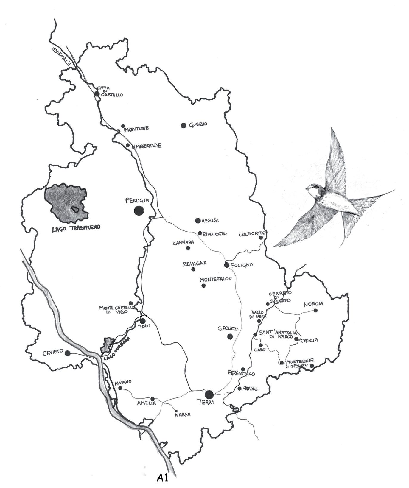 di ritorno e siano ancora tra quelle Rondini che dormono nel canneto della palude di Colfiorito. Non ci pesavano le lunghe giornate afose che facevano appiccicare gli indumenti, né di dormire poco e tantomeno sentivamo la fatica di avanzare con gli stivali nel fango assediati da insetti affamati o sotto il caldo torrido. Gli uccelli e la ricerca ci avevano affascinato, quei meravigliosi paesaggi, con tutte le forme e i colori degli esseri viventi erano un’esperienza unica. Avremmo fatto tutto quello che era possibile per scoprire i loro segreti, per aggiungere una briciola di conoscenza alla nostra infinita ignoranza. Siamo andati avanti per anni, cercando risposte alle nostre domande, che si arricchivano nel tempo. Nella ricerca è così, ogni risposta porta con sé una nuova domanda. Si formulano ipotesi e si cercano nuove strade per percorrere i nuovi orizzonti alla ricerca di prove, di conferme sulla validità della nostra ipotesi iniziale. Anche se molte risposte sono arrivate nel corso degli studi, affinati via via dalle varie tecniche, ad ogni risposta la meraviglia aumenta, arricchendosi di nuovi particolari. Lo stupore resta immutato, anche sminuzzato in tanti piccoli dettagli necessari alla comprensione di un fenomeno così complesso come la migrazione e l’ecologia di una specie in forte diminuzione in tutto il suo areale distributivo. La perfezione non è una cosa piccola ma sta anche nelle piccole cose. Lo scopo di questa pubblicazione è di avvicinare le persone all’osservazione delle Rondini e delle specie simili con le quali sono a volte confuse, suggerendo un itinerario di visita che consenta di osservarle nei loro ambienti naturali e di scoprire la loro presenza nell’arte in Umbria.