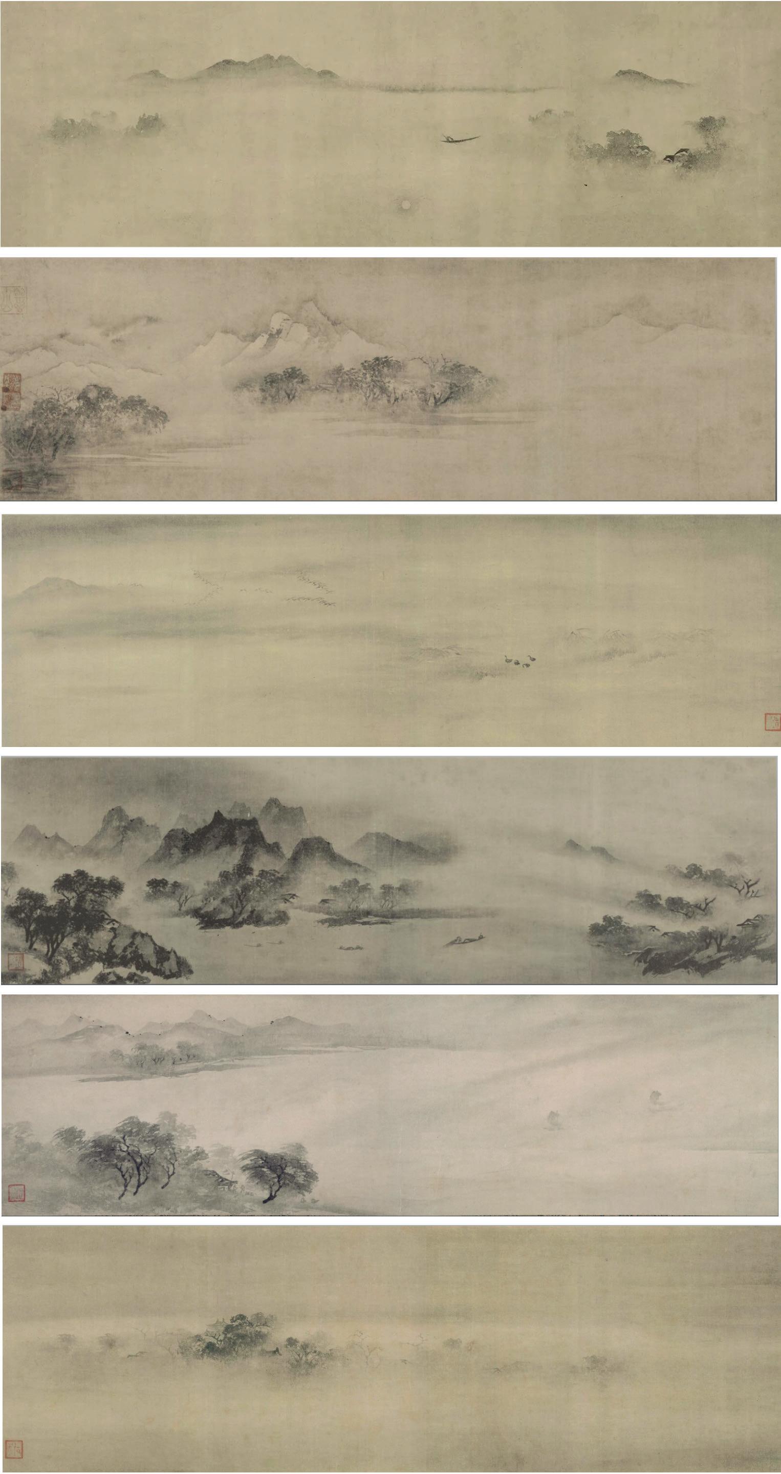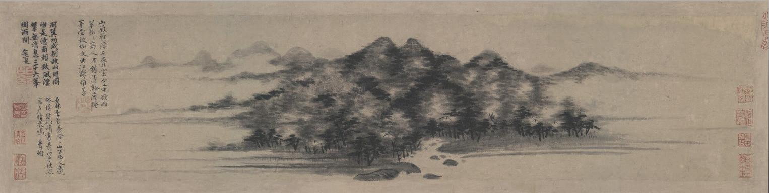 14 Ni Zan 倪瓒 (1301-1374) noto anche come Yunlin zi 云林子, fu un pittore, calligrafo e poeta, dissipò le ricchezze della famiglia e si dedicò al vagabondaggio nell'area del lago Tai (Taihu 太湖). Fu uno dei “Quattro Maestri di Yuan” (Yuansijia 元四家) insieme a Wu Zhen, Huang Gongwang e Wang Meng. Ni Zan eccelleva nella pittura di montagne e acque e di bambù, seguendo l'esempio di Dong Yuan e subendo l'influenza di Zhao Mengfu, caratterizzato da uno stile volto alla semplicità.