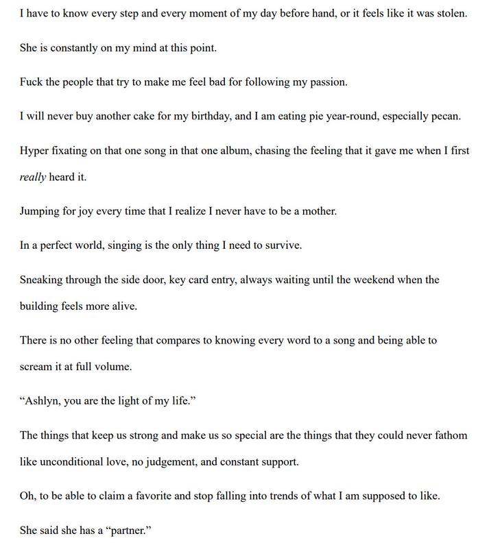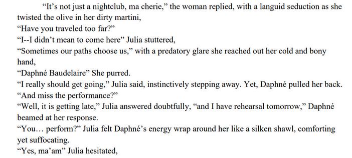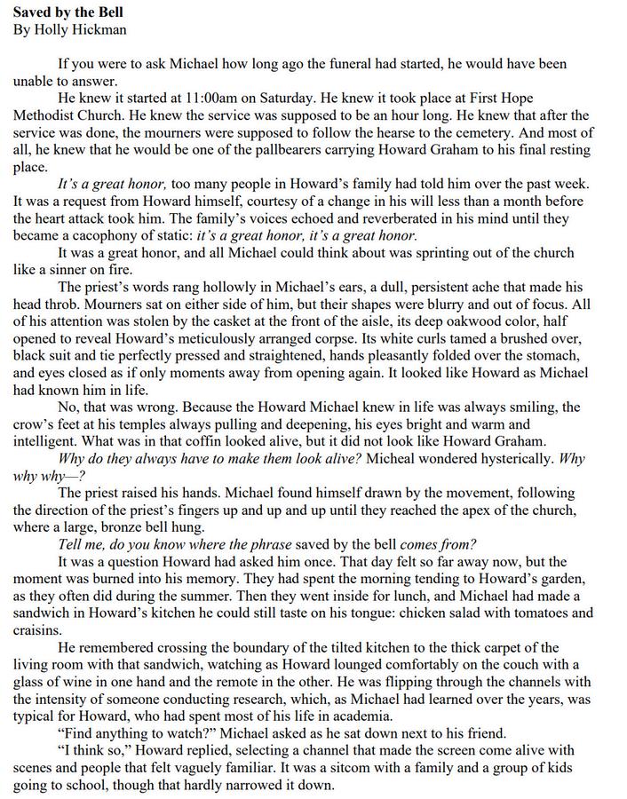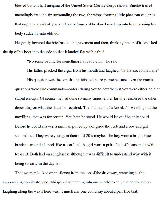 Onalloftheperfectlymanicuredlawnswiththeiridenticaldarkgreenmailboxes,in homesofvaryingneutralcolors,ifyoupeerthroughthefrontlacecurtainslongenough,Ican seeMrs.DottycookingforonewithherBibleopenedandreadyatthetable,herleatheryskin andmatchingbluesweatsuitbringingwithitthesweetscentoffreshlybakedstickybuns,the Bradfordfamilywitheyesunfocused,lukewarmmicrowavemeatloafontrays,TVlaughter echoingoffthewallsfilledwithpainfulpictureframeremindersofdeadmotherandwife,the palpableescapeoffatheranddaughteryetagaininalivingroomthatisanythingbut,andinstill anotherhouseisBob,athinandgreybeardedman,witheyeslikethebrownbottlesofyeasthe continuestoempty,sunkenintoareclinerandreadytowatchtheTVscreenuntilhepassesout; whileinourunassuminghouse,anornatecenterpieceisleftabandonedandcollectingdustatthe diningroomtable,silveruntouchedyettarnishing,thedeadhydrangeastheonlyevidencethat warmthonceflourishedhere,mydazedmotherlefttomakedinner,eyesconstantlyshiftingto thedoor,myfathercominghomefromalongshiftfullofsweat,thesmellofperfume,andthe faintaromaofleftoverrelationsstucktohiscoveralls,asubsequentcacophonyoficerattlingina glassandachildproofpillbottlepoppingopen,thewanderingeyesofmybrotherleftaloneto playwithme,soIruntothepool,despitetheawarenessofeyeswatchingmejump,gratefulfor theescapetothebottomwherethereisnoeyesandnosounds,onlythecatchingandreleasingof self-launchedtorpedoesstraighttothebottomofthebliss,emergingintotheeventualityof tomorrow’sSunday,allofusintowforouronceweeklyfamilytimetoattendasermonwherea preacheryellsof The Absolute Evil of Adulterers! andeveryweekashestandsinthepulpit,he buzzesonaboutthesamethemesofrespectandobedienceandGodliness,butaluncheonof shamsmilesandhandshakeslaterourfamilygoeshomewiththoughtsofshameandsexand silentobedienceswirlinginthestiflingcar,mybodyturnedtothewindowtoavoidtheever eagereyesofmybrotherplanningandwatching,theshoppingmallsandelementaryschoolI attendrollingpast,abriefintermissionofescapebeforewearebacktothewroughtirongates, thesamemanicuredlawnsandhomesinapprovedtones,exceptintheyardnexttoourfamily drivewaynowthereisBobstumblingaroundhisyard,hisred-facedgrinninginsharpcontrastto hispalebodyexposedandhalfclothedinat-shirt,adrinkinonehandandhimselfintheother,