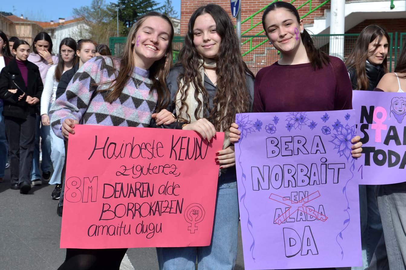 el alumnado de 1º de los ciclos formativos de AF3, AS2, y Grado Básico de Peluquería, Electricidad e Informática, así como los grupos de 3º de la ESO, han recorrido las calles de Muskiz en una kalejira reivindicativa.