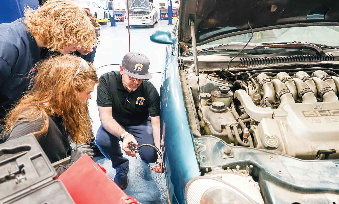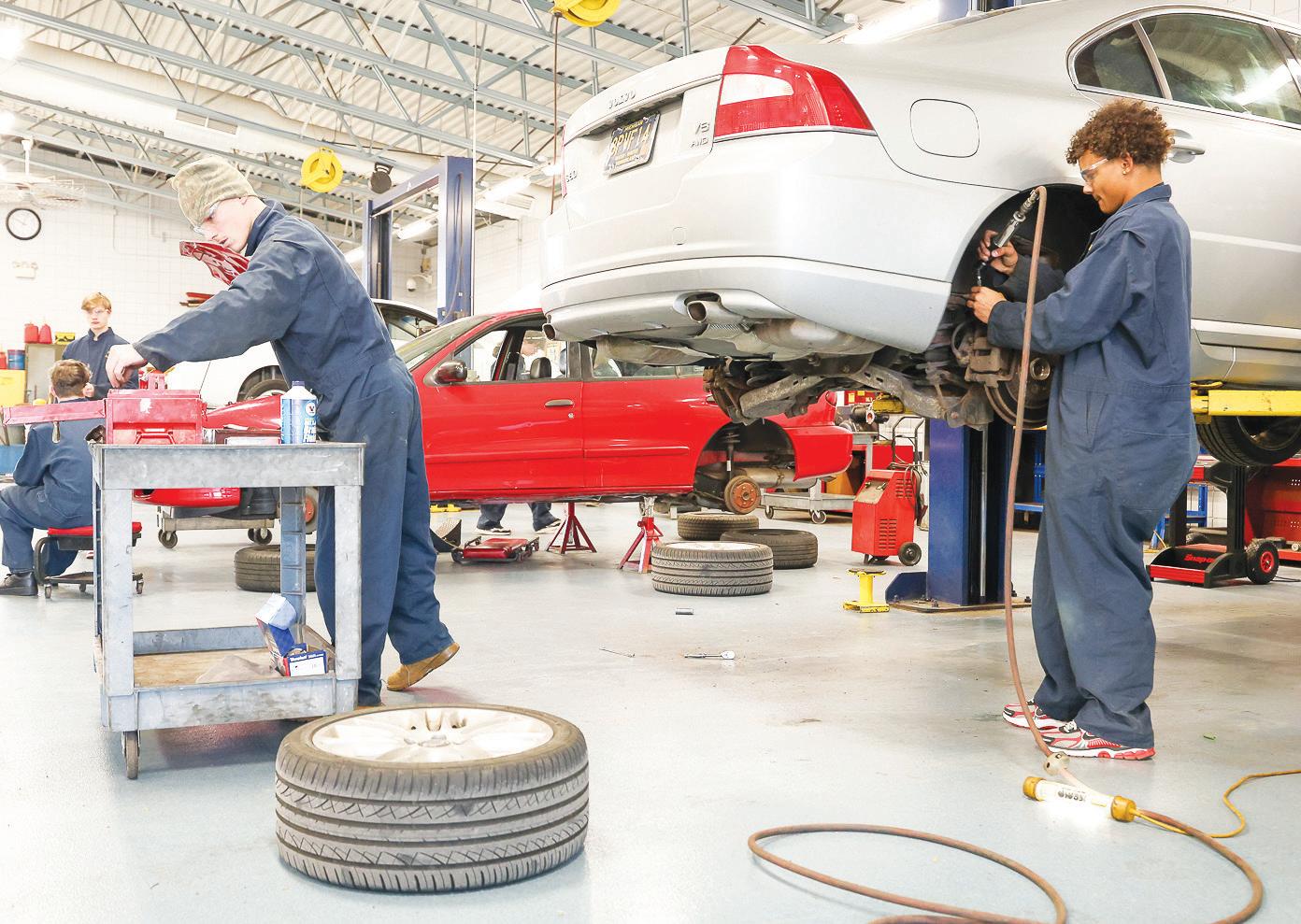 The auto class is set up to resemble a service station inside the school’s auto tech building on the Fitzgerald campus. Students learn how to perform a number of services, including basic maintenance, oil changes,