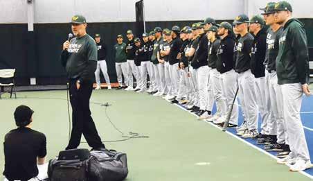 BELOW: Wayne State University baseball players and coaches speak to participants during a Born in De-