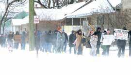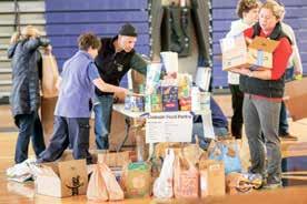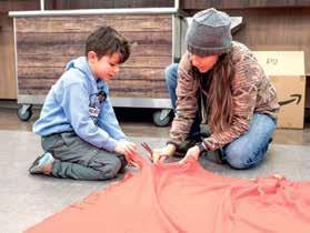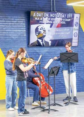 LEFT: Members of the Clawson High School Orchestra play music while people arrive for a day of service on Martin Luther King Jr. Day Jan. 19. The cities and school districts of Clawson, Berkley and Royal Oak combined to organize the day. ABOVE: Amid cold winter weather, attendees of the day of service participate in a walk with signs honoring Martin Luther King Jr. TOP RIGHT: Volunteers go through donations that will be sent to local organizations including the Clawson Food Pantry, the Salvation Army, Cass Social Services, Judson Center and the Open Hands Food Pantry. BOTTOM RIGHT: Teal Dimitrie and her son, Summit, 6, of Huntington Woods, work on making blankets that will be given to homeless people. Volunteers also helped sort donations, made cards and helped with a community art project.