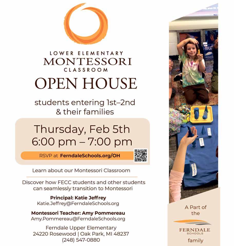 Tickets cost $15 per person for Ferndale residents and $20 per person for nonresidents. Prices will increase by $5 on Jan. 31. Preregistration is required for this event by Feb. 6. For more information or to register, contact Ferndale Parks and Recreation at (248) 544-6767, email the department at recreation@ferndalemi.gov or visit ferndalemi.gov/ government/parks-and-recreation.