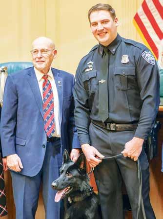 RIGHT: From left, Grosse Pointe Woods Mayor Arthur Bryant and Woods Public Safety officer Gill are joined by K-9 officer Arcos, a German shepherd.