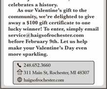Valentine’s Dinner at Meadow Brook Hall: Features cocktail and hors d’oeuvres reception, live music, three-course dinner at table for two, commemorative moving picture book and custom champagne flute keepsake, strolling of “Great Estate,” and more, 6:309:30 p.m., 350 Estate Drive in Rochester, registration required, (248) 364-6200, meadowbrookhall.org OUR