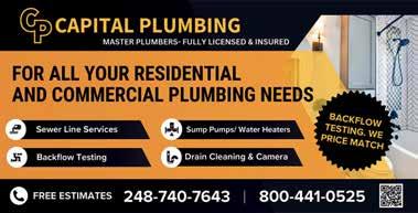 FullServicePlumbing. DrainCleaning,Sump Pumps,WaterHeaters, Leaks,Disposals, CameraInspections, BackflowTesting andMore. 586-477-7777 License#803020312