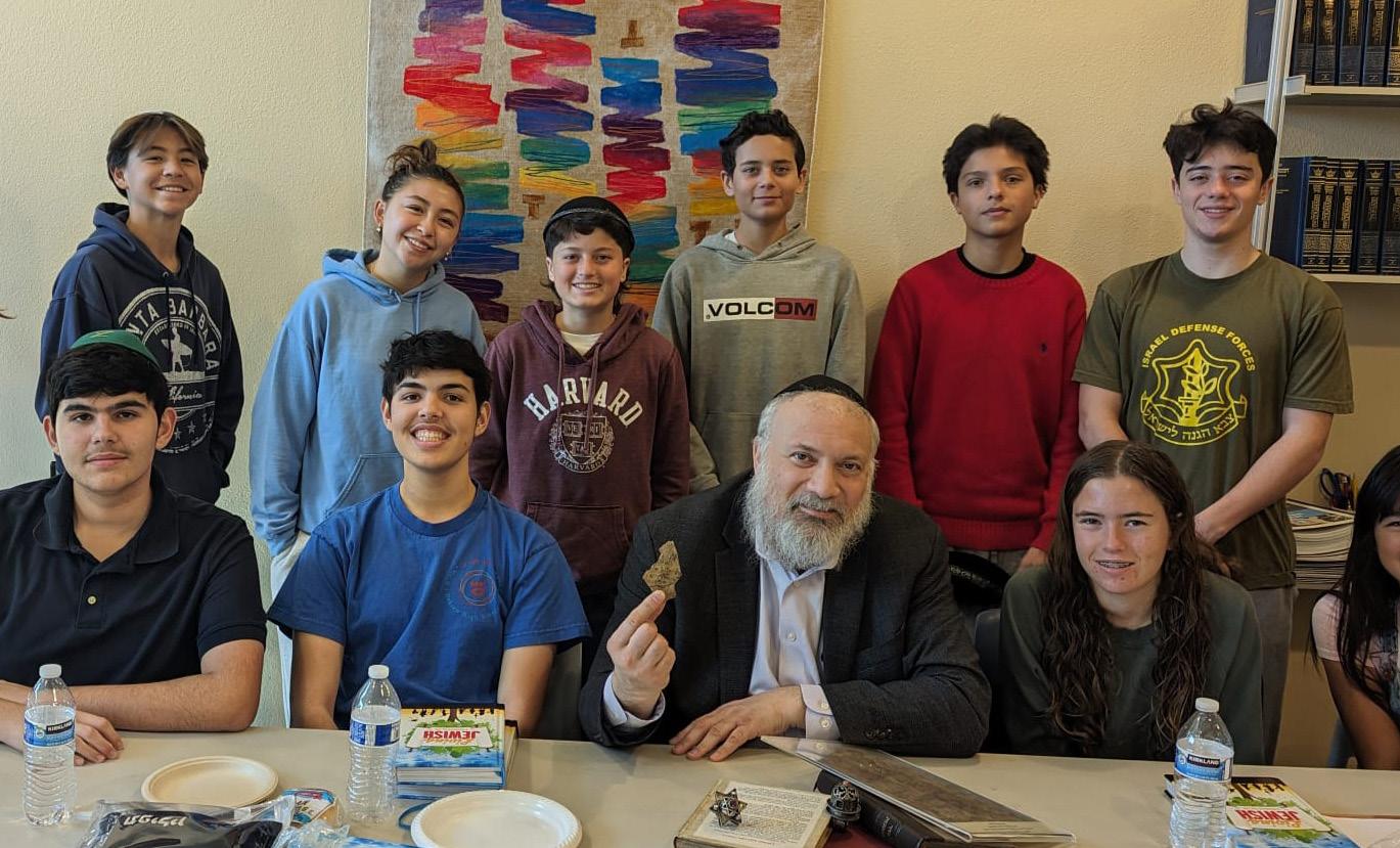 Rabbi Avraham Berns, a former librarian at the Rebbe’s Library at Chabad World Headquarters in Brooklyn, displays a stone from Mount Sinai with a visible thornbush depiction to Hebrew High students at Chabad in Los Alamitos, CA.
