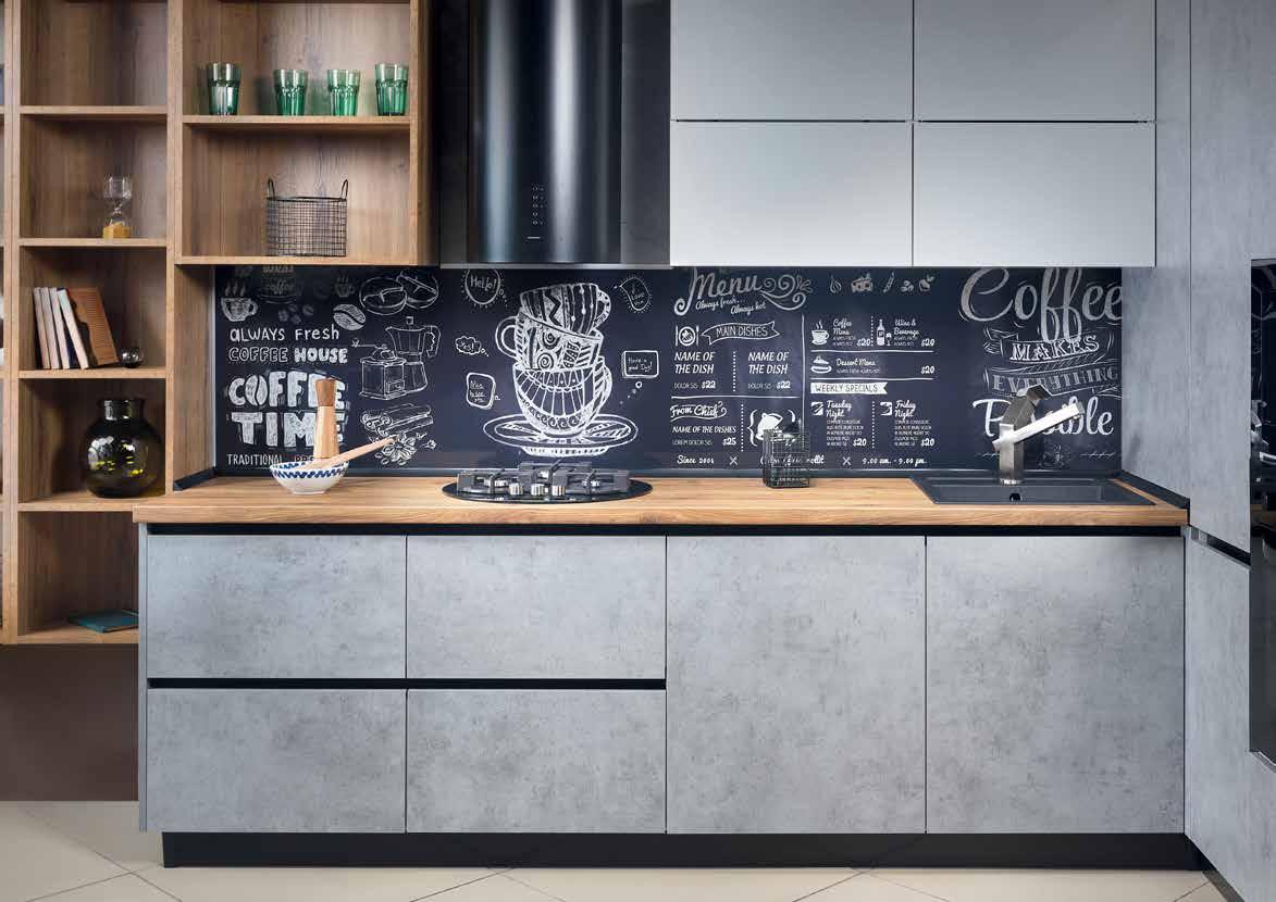 This is a versatile look that can be applied to a modern kitchen or to a work surface in a practical setting. Clean lines and grey colour are easy to accessorise with your house’s interior.