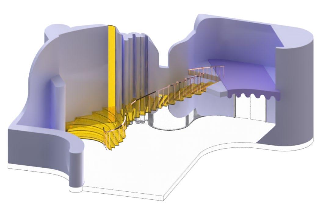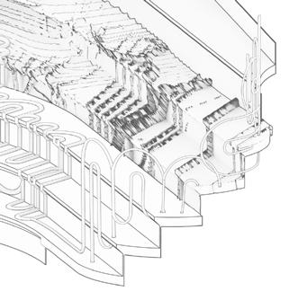 From the existing large of Higgins Hall, a new chunk emerges with distinct shapes and parameters through modifications to the poche. The transition from 2D to 3D is further enhanced, incorporating upgraded textures, coloration, and materials while retaining the original circulation concept. Multiple iterations of adding and subtracting different scales of repetitive curves result in the final chunk having its own circuit system, reminiscent of an integrated circuit.