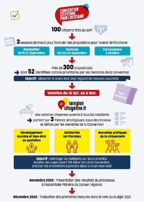 La convention citoyenne pour le climat (CCC), qui s’est déroulée entre 2019 et 2020, a rassemblé cent cinquante citoyens français tirés au sort dans l’objectif de définir des mesures permettant de diminuer d’au moins 40 % les émissions de gaz à effet de serre d’ici 2030 par rapport à 1990. À l’issue d’un travail régulier s’étalant sur neuf mois, les membres de la CCC ont remis cent qua rante-neuf propositions au gouvernement fran çais. Bien que la note de 3,3/10 ait été attribuée au gouvernement pour la prise en compte des propositions par les membres de la CCC, celle-ci a constitué une initiative innovante en matière de démocratie délibérative en France. La Région Occitanie a souhaité décliner la méthodologie employée par la CCC à l’échelle de son territoire.