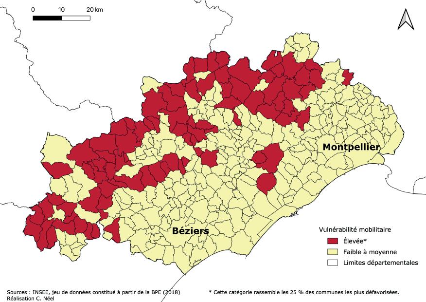 dispositifs d’aide alimentaire concentrés dans les espaces urbains. Les communes présentant l’indice le plus faible sont quant à elles situées dans l’espace périurbain de Montpellier (et de Béziers dans une moindre mesure). Ces résultats invitent donc à tenir compte des spécificités des espaces ruraux isolés dans les actions de lutte contre la précarité alimentaire.