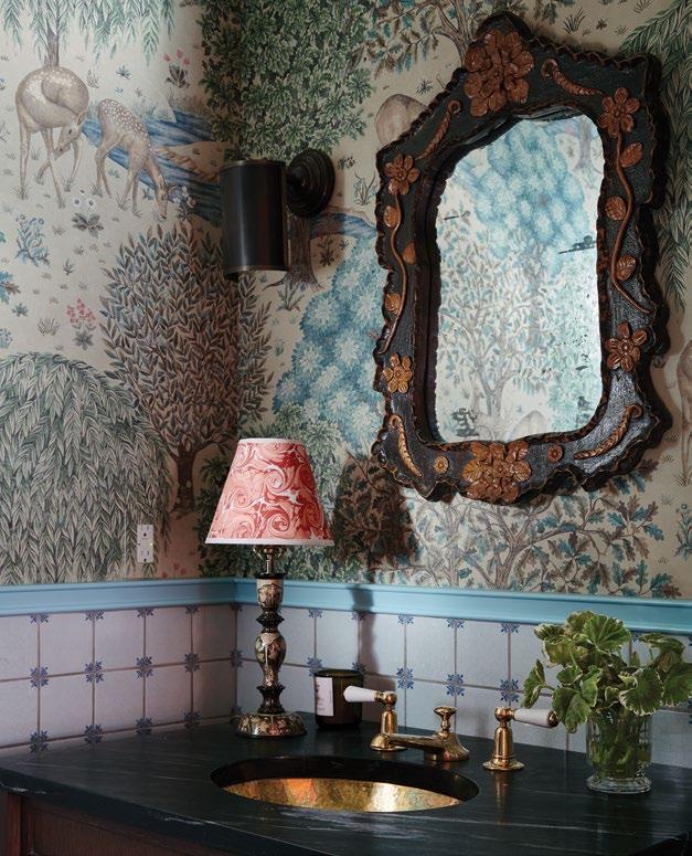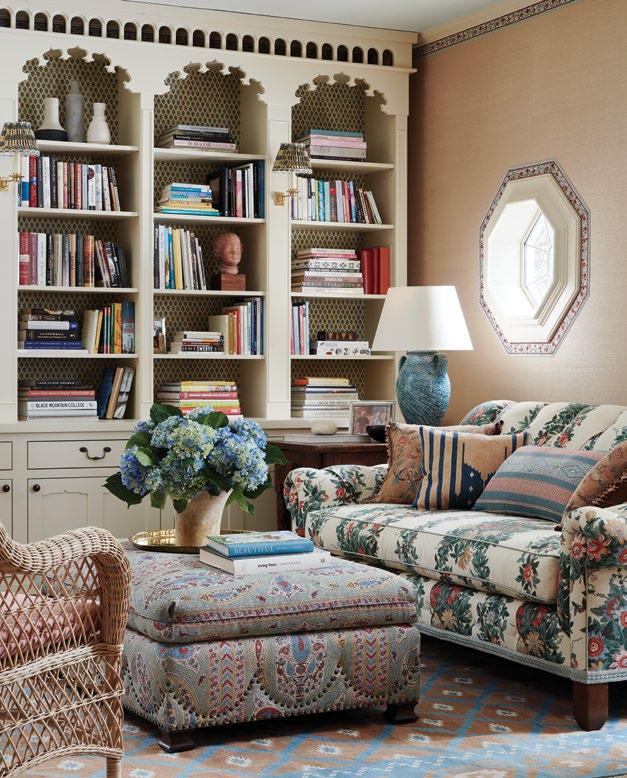 Wallpaper softens the bedrooms, baths, and hallways. “It felt necessary to balance out all of the wood in the main living areas,” says Sikes. There’s a custom embroidered trim around a sitting room doorway, sewn together from leftover fabric. Sikes is the rare designer with a full archive of his own patterns, fabrics, and trims to draw on—his collections with Schumacher offer endless options.
