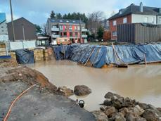 Noch anspruchsvoller erwies sich der hohe Wasseranfall. Durch das natürliche Geländerelief floss Oberflächenwasser ins tiefer gelegene Grundstück, hinzu kam Grundwasser. Zeitweise stand die Baugrube fast einen halben Meter unter Wasser, was einen Baustopp notwendig machte. Mit gezielten Drainagelösungen gelang es schließlich, den Wasserfluss zu lenken und das Gelände nachhaltig trockenzulegen.