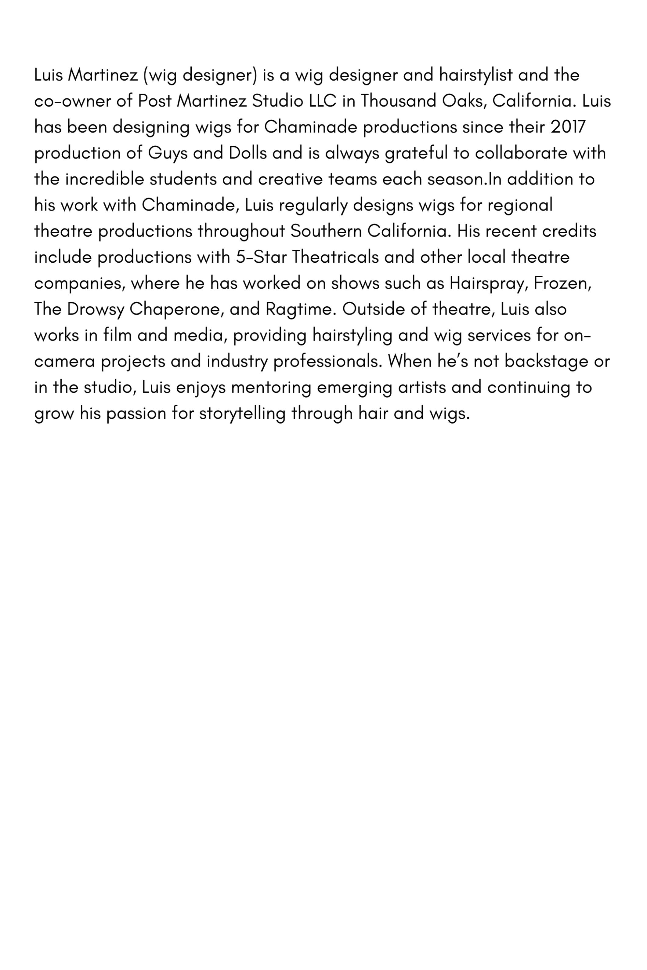 (Townsfolk) Lucas, a sophomore, is excited to participate in his fourth show and to perform as part of the cast for the first time with the Chaminade Players! As an Assistant Head of Electrics, he appreciates this opportunity and thanks his family, friends, the directors & creative team, and his Electrics Crew for their encouragement and support.