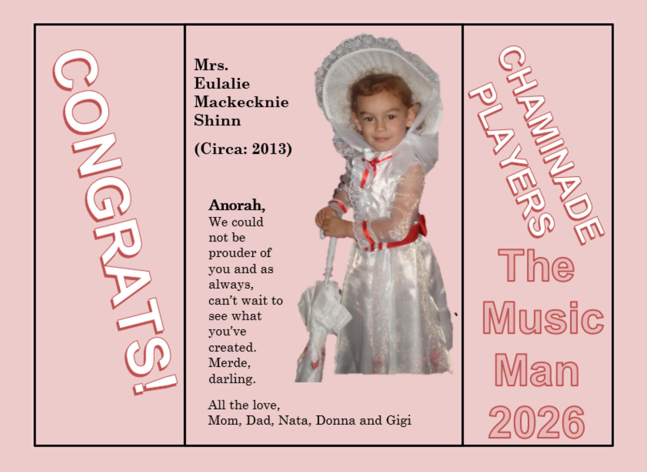 Anorah, a sophomore, is thrilled to be a part of The Music Man! She loves the theatrical is elated she’s found her second family in the Players. She’s also a Music Center Spotlight 2026 Merit winner in acting! She would like to thank the cast and crew, her family, friends, and Yvette, Lulu, Dan, and Bill for this experience. See you in River City!