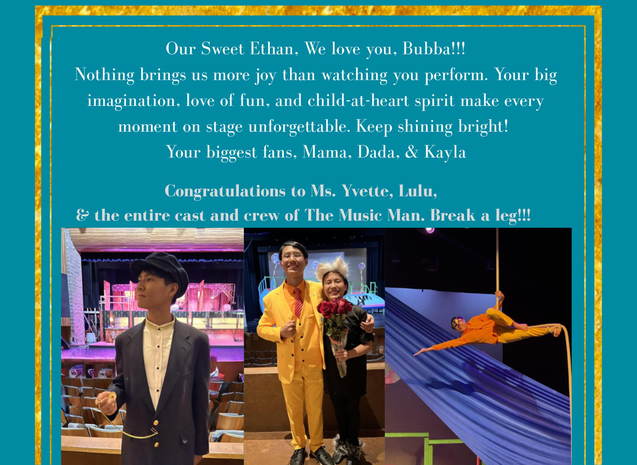 Ethan, a sophomore, is thrilled to be a part of his 5th play at Chaminade, the Music Man! He would like to thank Yvette, Lulu, to all of the Chaminade Players, and to the entire production for all the wonderful memories! And, especially to his family and friends for always supporting him!
