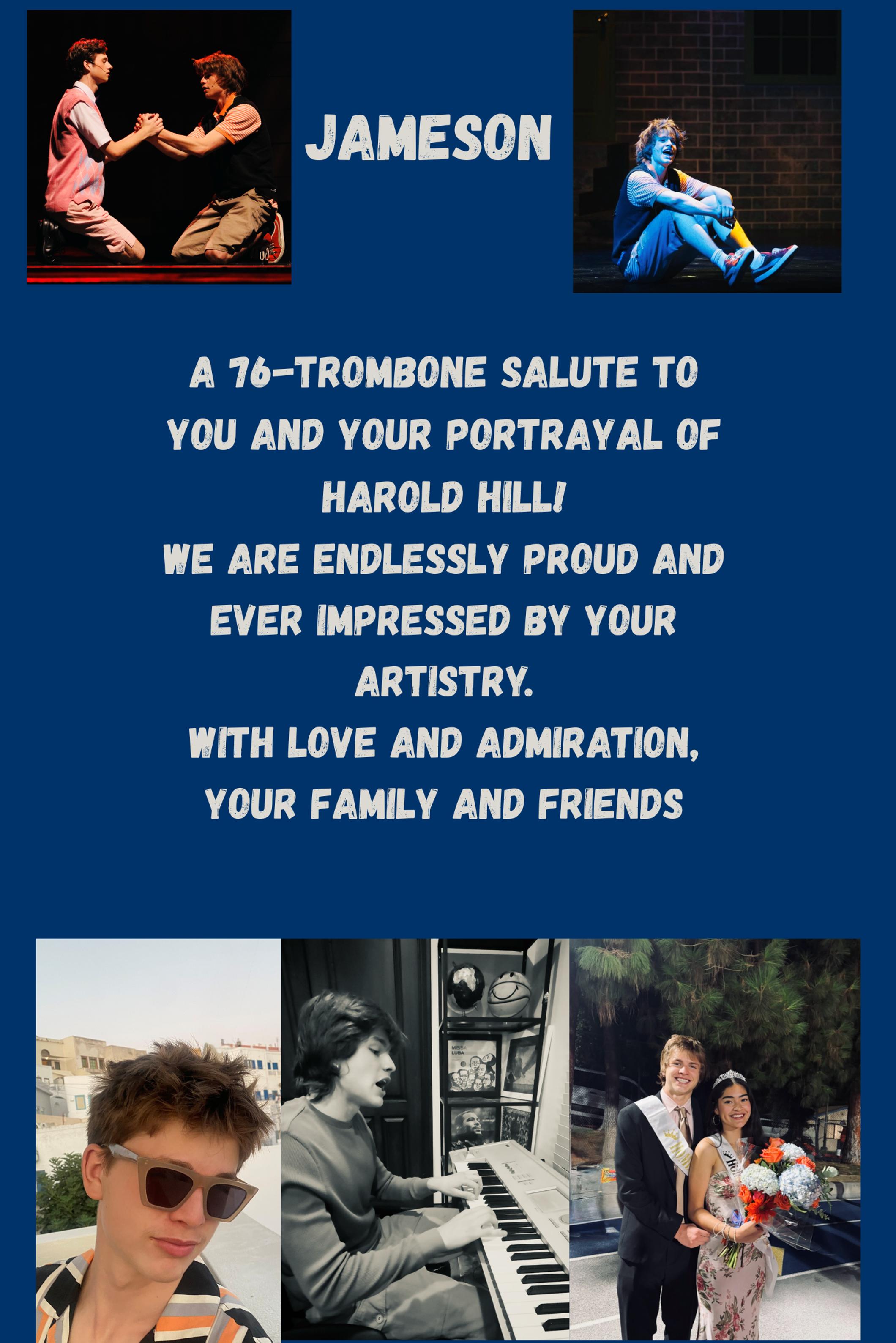 Jameson is so grateful for the opportunity to be a part of the wonderful The Music Man Cast. He is sad that this will be his last show at Chaminade as he is a Senior, but he is so glad he was able to be part of this amazing family. Jameson believes nothing builds community more than theatre and he is so grateful to have been surrounded by an amazing crew, cast, and adults. He'd like to leave you with his favorite quote of the show, "Pile up enough tomorrows and you'll find you've collected nothing but a lot of empty yesterdays." Don't live with regret, try something new. He hopes you enjoy the show!