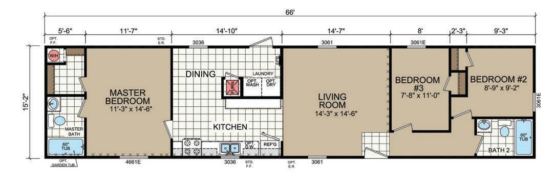 14’ x 66’ | 3 bed-2 bath | 880 sq.ft