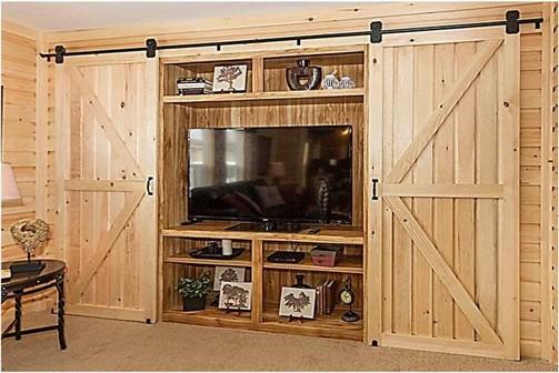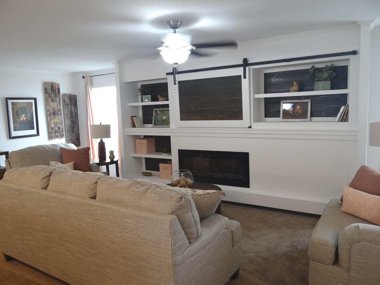 ENTERTAINMENT CENTER WITH BARN DOOR CONCEALING FLAT SCREEN TV AREA AND ELECTRIC FIREPLACE.