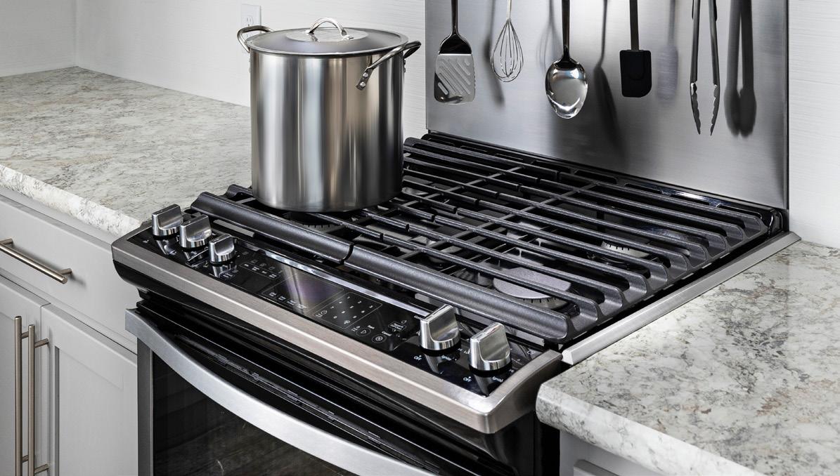 • Deluxe slide-in range with front controls (gas or electric) with Frozen Bake™ technology