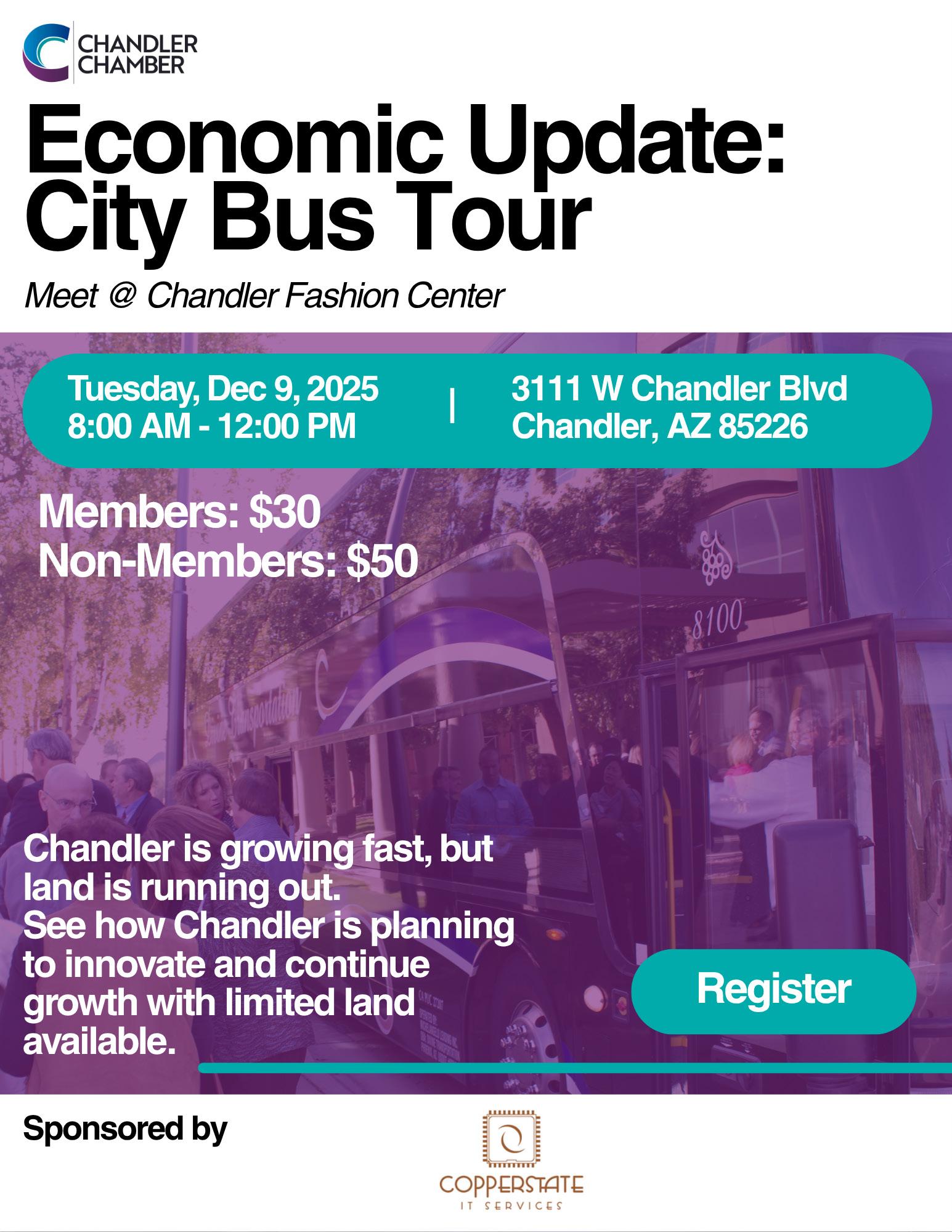 As Board Chair, I am especially proud of how the Chandler Chamber continues to bridge the gap between innovation and community connection. Events like the Bus Tour reflect the Chamber’s commitment to helping members stay informed and engaged with what is ahead for our city. I invite you to join us on December 9th to experience Chandler’s growth in motion and to see why our community remains one of the most dynamic and forward-thinking in Arizona.