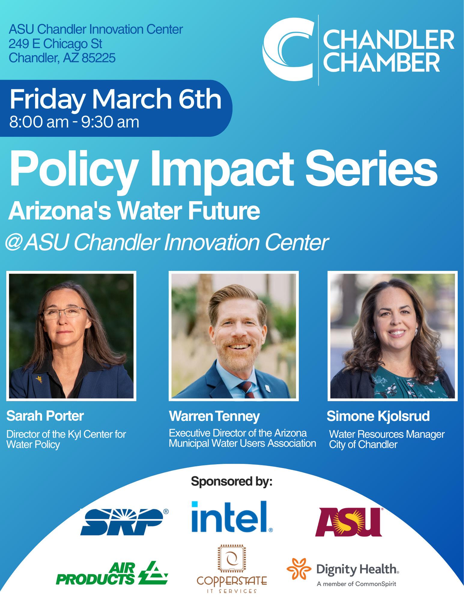 On March 6, we invite you to join us for our Policy Impact Series: Arizona’s Water Future. As Arizona continues planning for its long-term water needs, this discussion will bring together key leaders and experts to explore the future of our state’s water supply.
