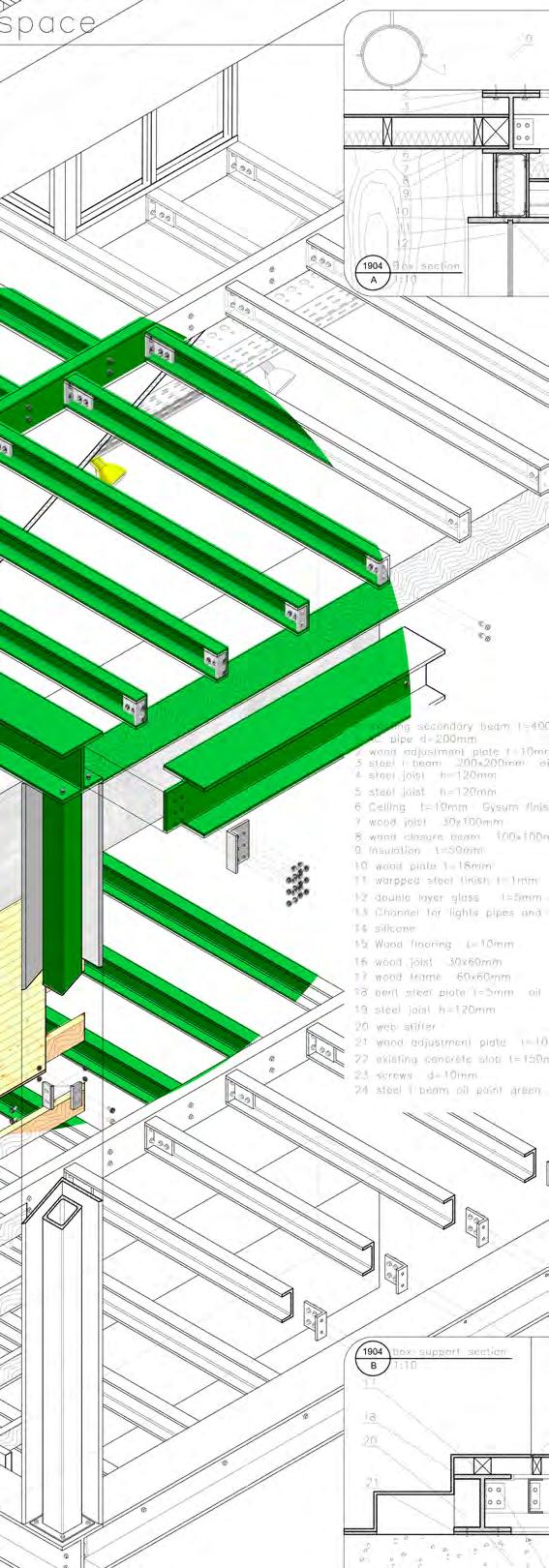 15 Wood flooring t=10mm 18 bent steel plate t=5mm oil paint 20 web stiffer 22 existing concrete slab t=150mm 23 screws d=10mm 24 steel I beam oil paint green 200x200mm