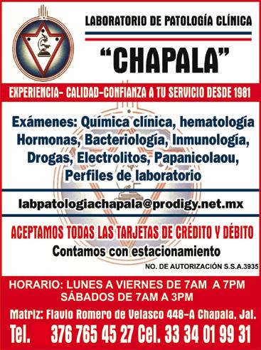 LABORATORIO DE PATOLOGÍA CLÍNICA CHAPALA.- Flavio Romero de Velasco 448-A, Tel. 376 7654527.