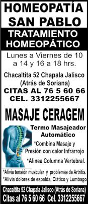 MASAJES TIPO ALPHABIÓTICO, PROF. MANUEL TAMAYO GUILLÉN.- Previa cita al 3314452569 o en el bal neario San Juan Cosalá, sába do y domingo y días festivos de 10 am a 4 pm.