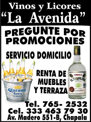 VINOS Y LICORES LA AVENIDA.- Av. Madero 551B Chapala. Tel: 376 765 25 32/ Cel: 3334637930.