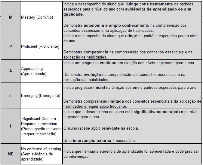 As notas são dadas trimestralmente e fornecem um retrato justo e preciso do desempenho de cada aluno durante esse período. É utilizada a seguinte escala de proficiência: