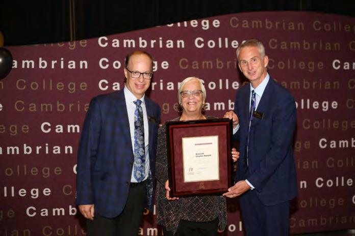 Cambrian College President Bill Best and Vice-President Shawn Poland thanked the institution’s many contributions on Thursday with a special presentation to the family of Kenneth Russell, acknowledging his contributions to the founding health science programming at the college. His daughter, Rosalind Russell, was presented with a special commemoration certificate acknowledging her father’s contributions. A resident of Espanola and Manitoulin Island in his twilight years, Russell diedonSeptember14thattheageof88.Domtarandothersupportersalso received accolades. Photos provided by Cambrian College and used with permission.