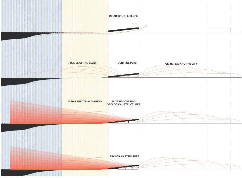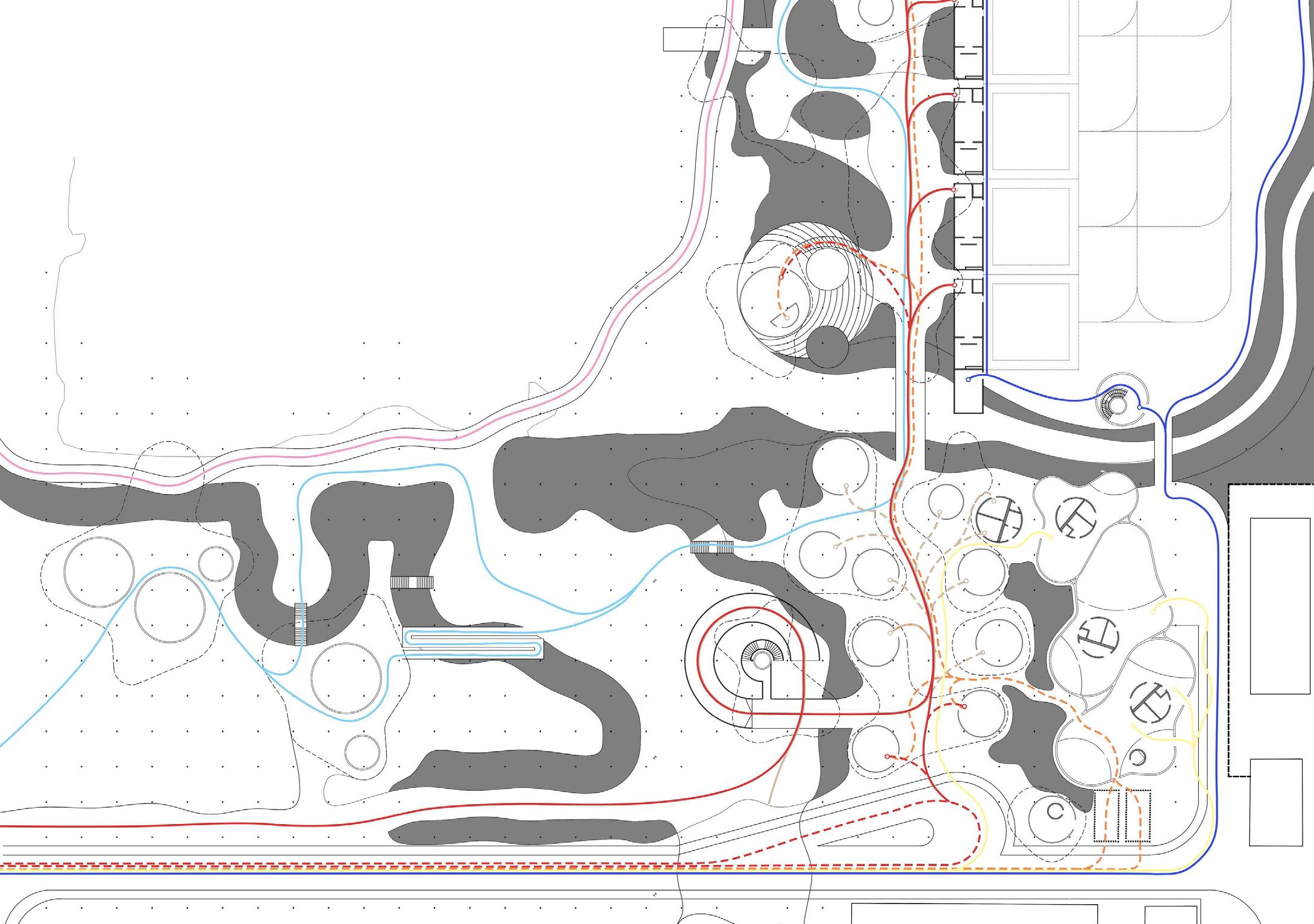 The park displays a duality of wandering ; an authoritarian promenade which is defined by a path to be followed, and a cinematographic promenade where people are able to infiltrate the landscapes creating different visual frames dictated by the scattered follies.